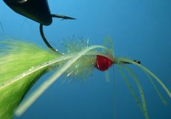 Tying NotesThe Bass Bully featured on this page is the smallmouth version of the original Bass Bully used for largemouth bass. The original Bass Bully was designed as a vertical-drop lure with a twister tail instead of a rabbit strip. The recipe for the original Bass Bully can be found in our second book, "Largemouth Bass Fly-Fishing - Beyond the Basics". The Bass Bully has been effective in black, olive, rust, and chartreuse. Depending on how it's fished it may be taken as a crayfish, hellgrammite, sculpin or mad tom (stonecat). The Bass Bully in the tying sequence that follows is tied in chartreuse. The Bass Bully can be tied with or without a weedguard. If you choose a weedguard, simply tie in a piece of 25-pound test soft mono secured at the hook's bend. You can attach the tip of the mono just below the hook's eye by forming a burnt mono end as you finish off the fly. The rabbit (zonker) strip tail should be the length of the hook plus 1/8th inch. The measurement should be of the hide, not the hide and hair. The Zonker strip should be inverted so that the hair faces downward when the strip is attached to the hook's shank to form the tail. The finished Bass Bully will ride with the hook point up when the fly is fished. The chenille for the gills should make a ball. Just make two side by side wraps and add a third wrap between the first two wraps. The finished wraps should appear rounded like a small ball. The ball helps flare the legs of the fly. The gills also provide a contrasting color. Use two full strips of Sili-legs cut in half to create two pairs of legs tied with two strands on the bottom of the hook and two legs tied above. Tie them in place so they extend away from the hook's shank at roughly a 90-degree angle to the body. If you haven't used wool to create the head on a fly pattern, don't be intimadated. It's easy to do as you will see in the tying sequence. The sculpin wool for the head is the same wool found in aviator jackets. It may be listed in fly tying catalogs under a number of names including lamb's wool, ram's wool, and sculpin wool. Angling TipsThe Bass Bully can be fished along the edges of shoals and boulders, cast into the seams of converging currents, and fished as a true vertical drop fly in slow pools. Students in our warmwater fly fishing school consistently caught more large fish on the Bass Bully that on other flies. The weight of the Bass Bully can be adjusted by altering the size of the barbell eyes. I prefer to use extra-small barbell eyes and then use a sink-tip or full sinking line to get the fly down but medium barbell eyes are important if you need to get the fly to the bottom in current as is frequently the case in smallmouth streams. The Bass Bully with extra-small eyes casts well on a five or six weight rod but a Bully with medium eyes really requires a seven or eight weight rod to keep from you from making "Chuck and Duck" a full-time contact sport. I prefer to use eight to twelve pound test leaders and often attach the Bass Bully to the tippet with a fixed-loop knot to accentuate the action. My favorite presentation is to allow the Bully to settle to the bottom. Then I point the rod tip directly at the fly. I remove the slack in the line, then lift the rod tip four to six inches, then drop the rod tip back to its original position and strip only to remove any slack line. This "lift-drop-lift" strip retrieve causes the fly to swim off the bottom as if trying to escape. When the Bully settles back to the bottom the retireve is continued. The first time Roxanne and I fished the Bass Bully was an early morning on the Buffalo River in Northwest Arkansas and in the first few minutes of the outing I caught the smallmouth bass that is on the cover of our latest book, "Smallmouth Bass Fly Fishing". Tying Steps![]() Step 1 Clamp the hook in the vice and crimp the barb. Attach the tying thread and lay down a base of thread back to the hook's bend as shown. ![]() Step 2 Cut a piece of rabbit (zonker) strip for the tail. The hide of the tail should be equal to the length of the hook plus 1/8th inch. Attach the rabbit strip to the top of the hook's shank with the hide facing up. ![]() Step 3 Tie in a piece of Ice Chenille or Estaz at the base of the rabbit strip tail and wrap the chenille forward to the mid-point of the hook's shank. Tie off the chenille with a couple wraps of thread and remove the excess. ![]() Step 4 Tie in a piece of red chenille, for the gills, at the base of the Ice Chenille body and make two side by side wraps of the chenille followed by a third wrap in the middle of the first two wraps. Tie off the chenille and remove any excess. ![]() Step 5 This is how the ball of chenille should look after it has been made and prior to the next step. ![]() Step 6 Cut in half two full strips of Sili-legs to make the two sets of legs for the Bass Bully. Invert the fly and tie in the first set of legs with figure-eight wraps on the bottom of the hook's shank at the base of the gills. ![]() Step 7 Without moving the thread, return the fly to the upright position and add the second set of legs on the top of the hook's shank. Next, stroke the legs back with your free hand and take a couple of wraps of thread rearward over the legs so that they flare out at a 90 degree angle to the body. ![]() Step 8 Now tie in the lead barbell eyes with several figure-eight wraps at the base of the legs. You may want to use a bit of super glue to make sure that the eyes are tightly locked in place. ![]() Step 9 Tie in a small bunch of wool on top of the hook's shank behind the lead eyes with two or three wraps of thread directly on top of each other in the center of the wool. Without moving the thread, invert the fly and tie in another bunch of wool on the bottom of the hooks shank. Move the thread to directly in front of the lead eyes and return the hook to the upright position. ![]() Step 10 Now, repeat the same process at the front of the eyes by adding a small bunc