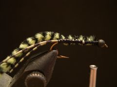 Angling tipsFish the CVC Nymph on a weight-forward line with a seven and one-half to nine foot 3X tapered leader. I like to fish the nymph with short steady strips. Tying Instructions![]() Step 1. Slip a cyclops bead over the hook point and move it up to the hook eye. Start the thread at the the bead and lay down a heavy base of thread from the bead back to the hook bend. ![]() Step 2 Tie in the tail as per the instructions in the Tying Notes section. Then move the thread to the base of the bead. ![]() Step 3 Tie in a three-inch piece of chartreuse veriagated chenille at the base of the bead and bind it down to the top of the shank back to the base of the tail. ![]() Step 4 Bind down a six-inch piece of chartreuse chenille on top of the veriagated chenille from the bead back to the base of the tail. ![]() Step 5 Move the thread to the two-third's point on the hook shank and add the legs as described in the Tying Notes section.