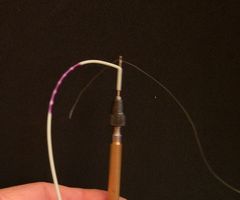 If you can't find a Pin Vice at your local hobby store you can order one from StoneRiverOutfitter.com. They have a beautiful mail-order catalog. You should request a copy. I purchase fly tying materials from them frequently and they are one of the best mail-order houses I know. Creating the Knotless Line to Leader Connection![]() Step 1 Make sure that the tip of your fly line that will be attached to your leader is trimmed evenly. ![]() Step 2 Lock the needle point in the pin vice so that the part with the eye is protruding about three-quarters of an inch. Gripping the tip of the fly line between your thumb and index finger begin to insert the needel into the fly line. It might help to rotate the vice during this process. Make sure that the needle doesn't exit the fly line until you have inserted about one-half inch of the needle. Bend the line so that the needle's eye exits the line on the side. You might want to use a hard surface like your bench top to press the line and the needle against in order to help the needle exit the line. ![]() Step 3 Thread the tippet end of the leader through the needle's eye until about an inch or so of the tippet is protruding through the needle's eye. ![]() Step 4 Then pull on the pin vice until the tippet end is pulled out the front of the fly line and protrudes about an inch or so from the fly line tip. ![]() Step 5 Grasp the leader tippet and pull the leader through the fly line until only about two-inches of the leader butt remains above the hole made in the fly line. You will use the leader butt in a later step as you finish attaching the leader to the line. ![]() Step 6 Lightly sand and rough up about one-half inch of the leader just in front of the fly line tip. This is the area where you will apply the super glue and the roughed up area helps the glue stick to the leader making for a secure bond with the fly line. ![]() Step 7 Cover the roughed up area of the leader with super glue. This step and the next step must be done quickly before the glue dries. Make sure that you don't get any glue on your fingers or the fly line. ![]() Step 8 Quickly grasp the tip of the fly line with the thumb and index finger of your right hand and and pull the tag end of the leader with your left hand until the roughed part of the leader with the glue on it is inside the tip of the fly line. You can see in this photo that the leader butt is now longer by one-half inch because it has been pulled through the line. ![]() Step 9 Allow a few moments for the glue to set and then trim the butt with a double-edge razor blade. The blade in the photo is one-half of a double-edge blade. Make sure you don't cut the fly line as you're removing the excess leader butt with the blade. ![]() Step10 Lastly, add a small drop of super glue to the exit hole on the line where the needle exited in an earlier step. Then, stretch the line and leader and rub and compress the spot that received the last drop of glue until the line-leader connection is straight. ![]() Step 11 Grasp the leader with one hand and the fly line with the other and pull as hard as you can to test the connection. This is how the rig should look when all is done. If this entire procedure is done properly you can be assured that the leader will break before the connection does. I have never had a line and leader fastened this way come apart. If you are curious, the marks on the fly line indicate the line size. I make those marks on the line with a waterproof marker and then I always know what weight is on a given fly reel.